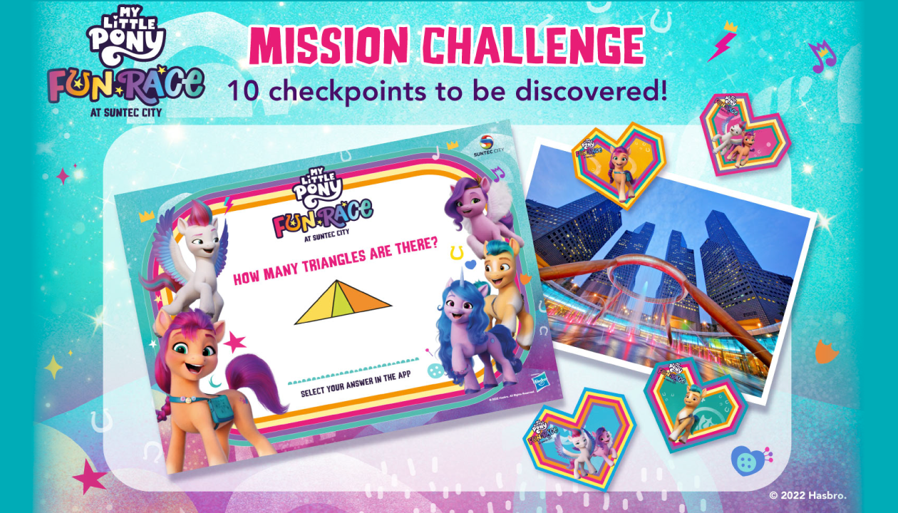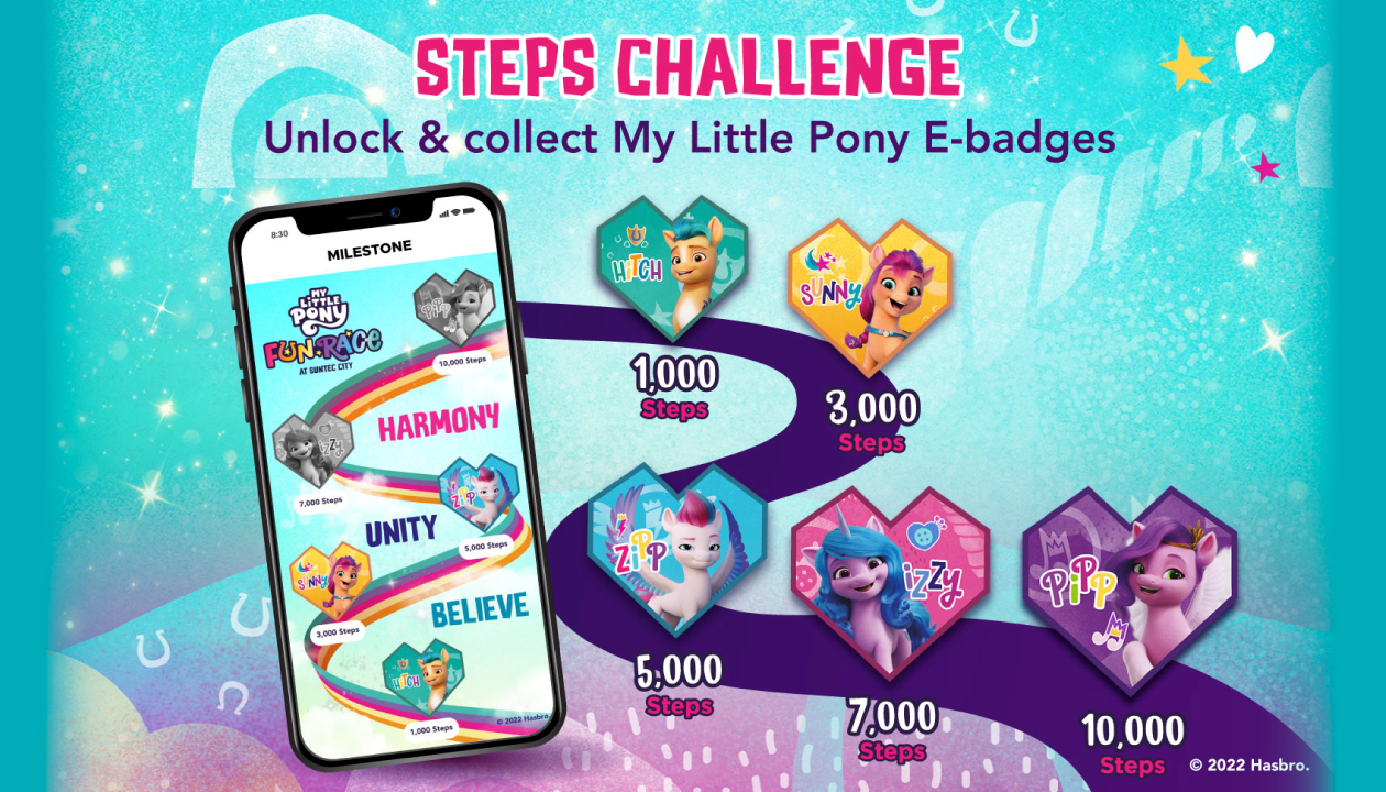 Participants were tasked with clearing 10 mission checkpoints scattered across the mall, where they solved quizzes and interacted with exclusive augmented reality (AR) Instagram filters featuring their favorite ponies. To encourage active living, a "Steps Challenge" was integrated, allowing participants to earn extra Suntec+ points and brand vouchers by hitting movement milestones anytime, anywhere.